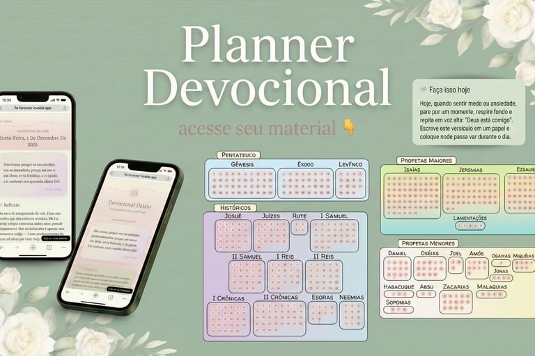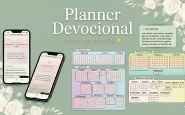 O Planner Devocional foi criado para te ajudar a organizar sua vida espiritual com propósito. Nele você encontra espaço para leituras bíblicas, orações, reflexões e metas espirituais, fortalecendo sua intimidade com Deus no dia a dia.